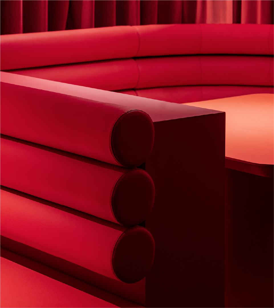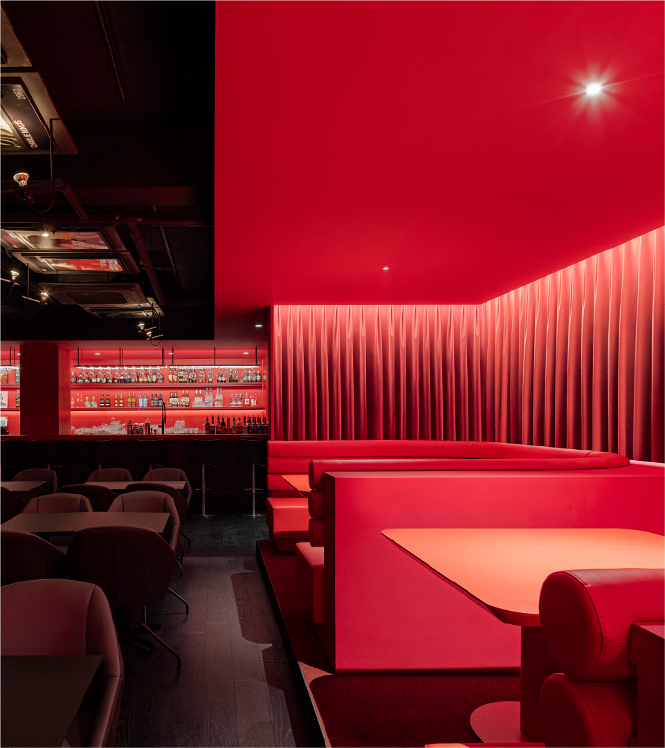 바 카운터, 다이닝, 무대—세 영역이 하나의 조명 아래 연결된다. 바 카운터에서는 주류 진열장 너머로 어두운 목재와 금속 디테일이 공연장의 전통을 잇는다. 매끄러운 가죽, 커튼의 주름, 유리의 광택—각기 다른 물성이 하나의 톤으로 수렴한다. 다이닝 영역에서는 곡선형 부스 좌석이 반복 배치되어 리드미컬한 패턴을 형성하고, 좌석의 감싸는 형태가 관객과 무대 사이에 친밀한 거리를 만든다. 무대는 이 모든 것의 중심이다. 그랜드 피아노의 검은 광택이 조명을 받아 붉게 물들고, 천장의 노출 파이프와 콘크리트가 날것의 질감을 더한다. 무대와 객석 사이 거리가 짧아, 연주자의 호흡과 현의 진동이 직접 전달되는 구조다. 음향적 친밀감을 의도한 설계다.