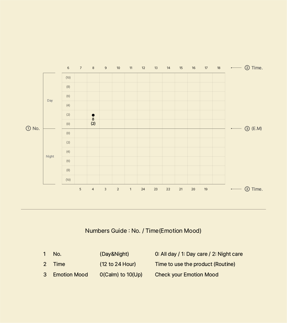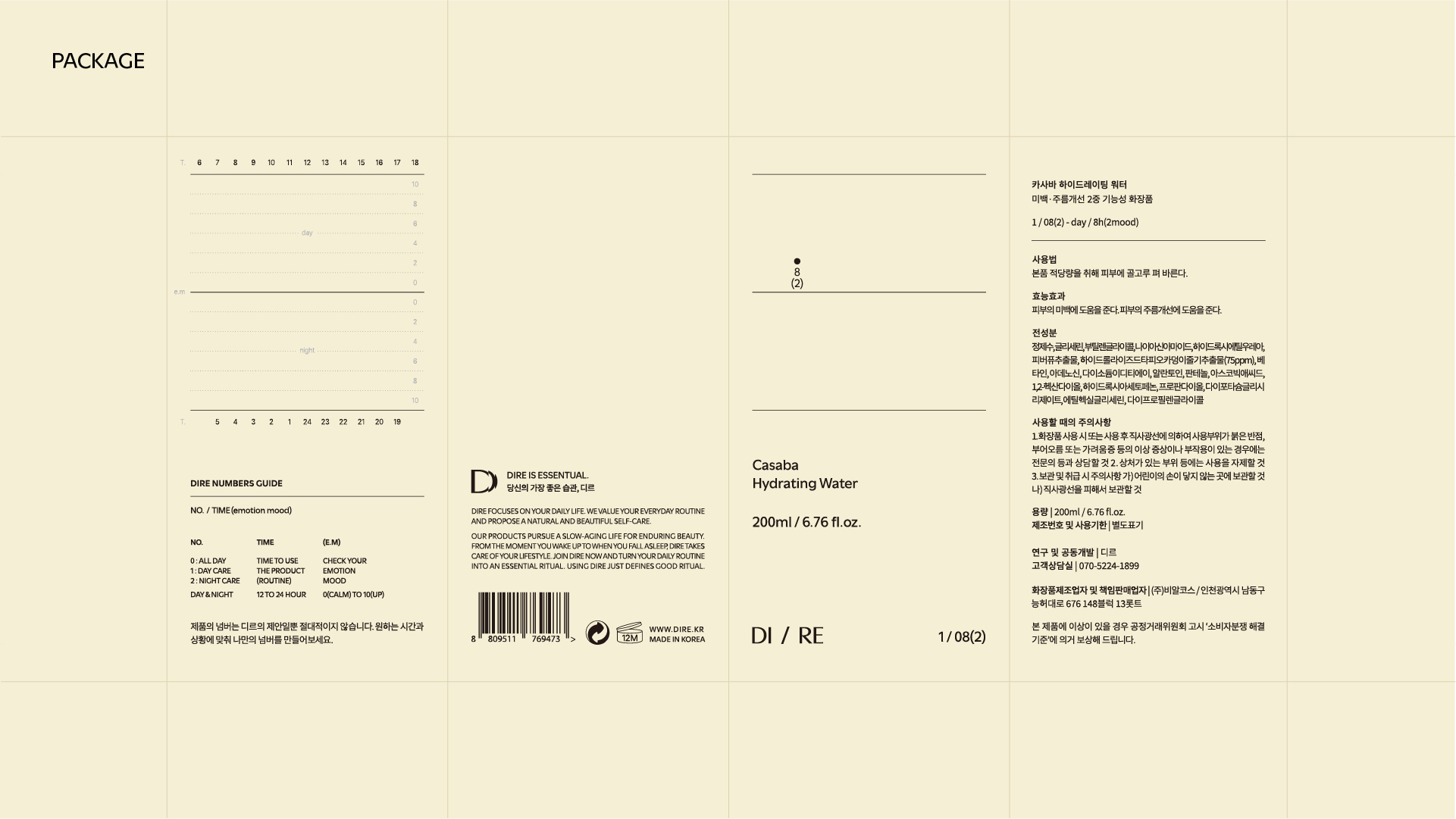 쇼핑백의 표면에는 그래프 모티브가 반복 패턴으로 인쇄된다. 박스를 감싸는 DIRE Night Brown(#B89F82) 패키징 테이프에도 동일한 그래프 패턴이 작게 새겨져 있다. 소비자가 테이프를 뜯고 제품을 꺼내는 순간부터 브랜드의 기록 모티브와 마주하게 되는 설계다. DIRE NUMBERS GUIDE는 시간대와 감정 상태를 수직-수평 그리드로 시각화한 표로, 제품 가이드라인에 포함되어 소비자가 자신의 케어 패턴을 직접 기록하고 추적할 수 있는 도구가 된다.