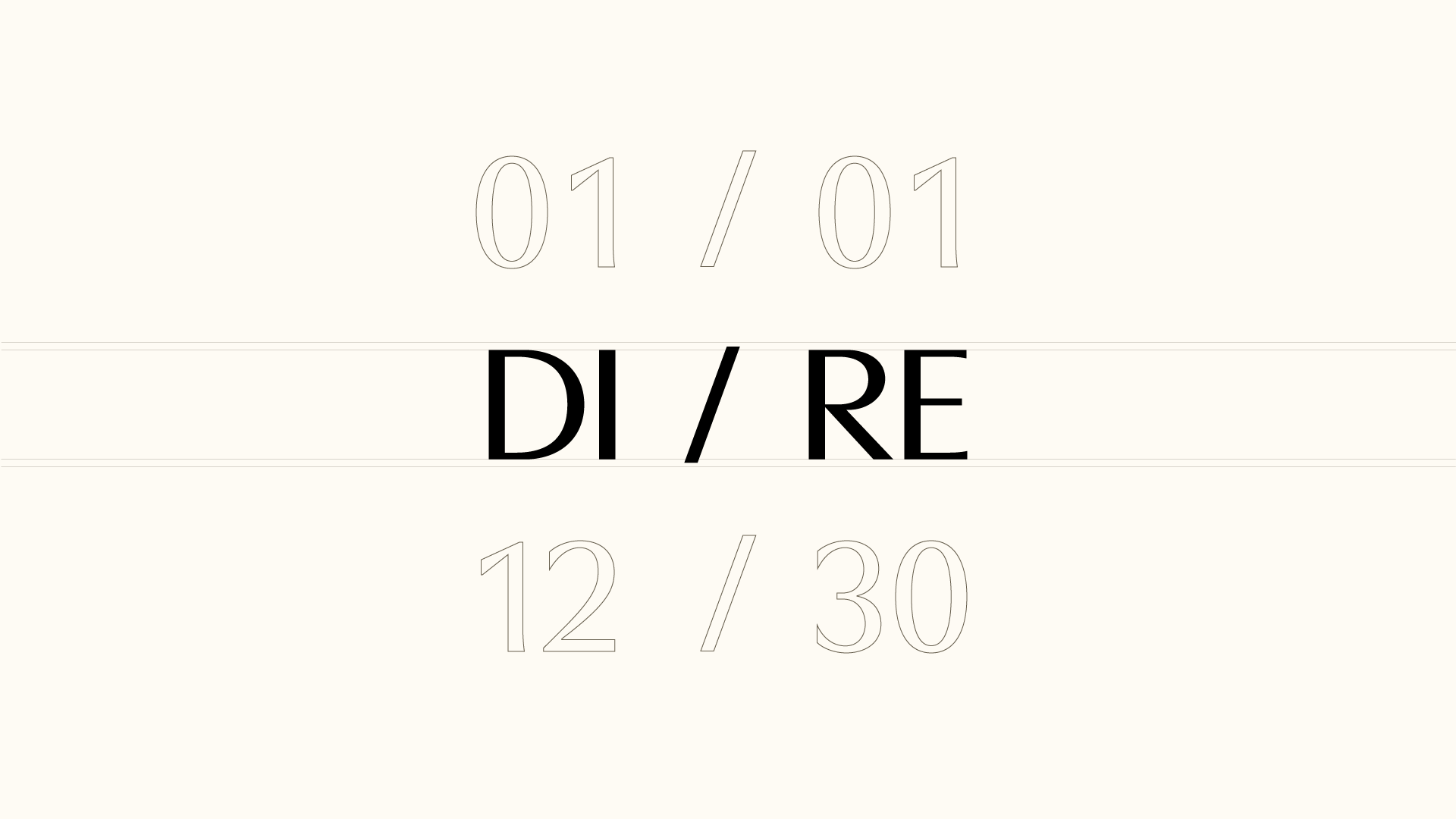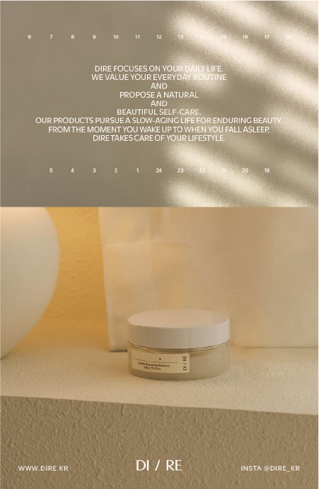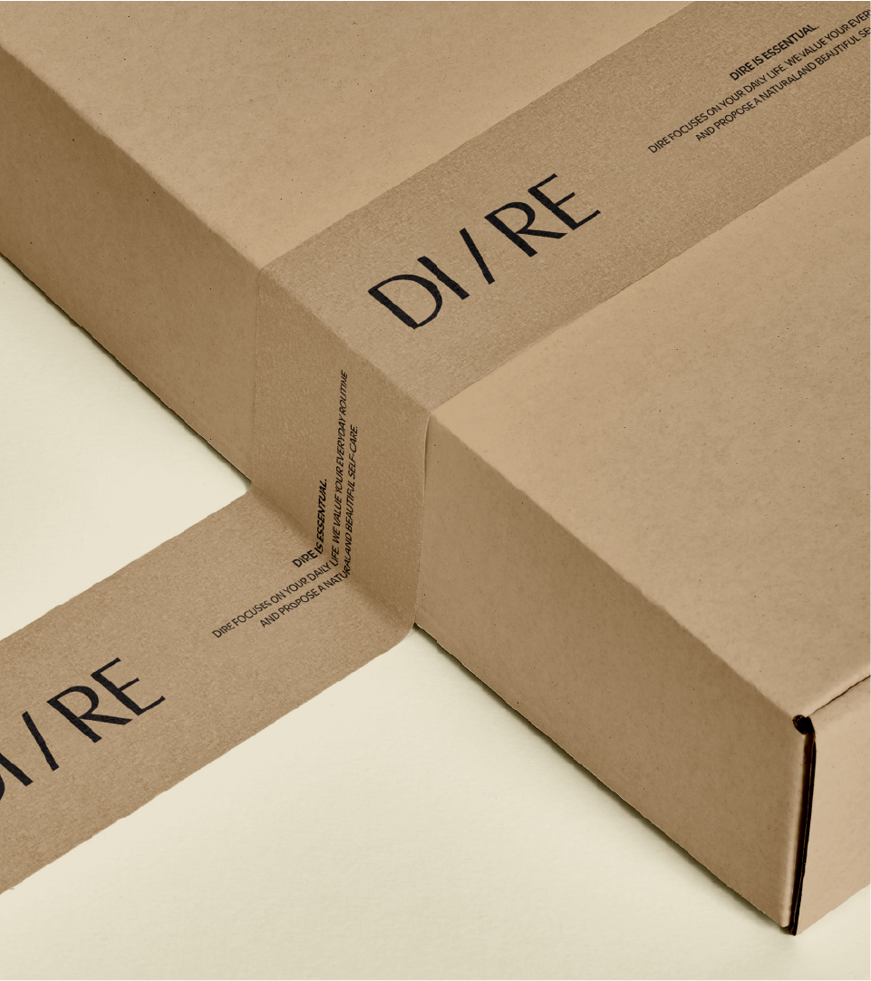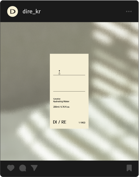 DIRE의 워드마크에서 가장 먼저 눈에 들어오는 것은 슬래시(/)다. DI / RE. 이 한 획은 시간의 분할이자 연결이다. 하루를 아침과 밤으로 나누고, 동시에 그 사이의 연속성을 암시한다. 슬래시 모티브는 브랜드명의 구조적 특성을 시각적으로 강화하면서, 일상의 반복과 케어 패턴의 지속을 직관적으로 전달한다.