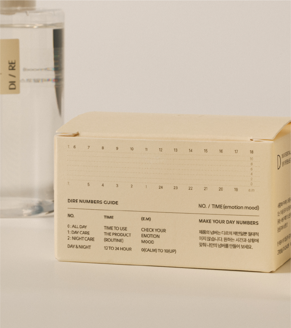 한국 스킨케어 시장에서 대부분의 브랜드는 성분의 효능이나 기술적 차별성을 앞세운다. DIRE가 점유하려는 자리는 다르다. 아침에 눈뜨고 세안하는 순간부터 잠들기 전 마지막 케어까지, 소비자의 24시간 안에서 자연스럽게 존재하는 것. 브랜드가 제안하는 것은 특정 성분이 아니라 건강한 의례를 형성하고 유지하는 시스템이다. DIRE의 시장 포지셔닝은 습관 추적과 감정 기록을 통합한 독자적 DIRE NUMBERS GUIDE 시스템으로 구체화된다.