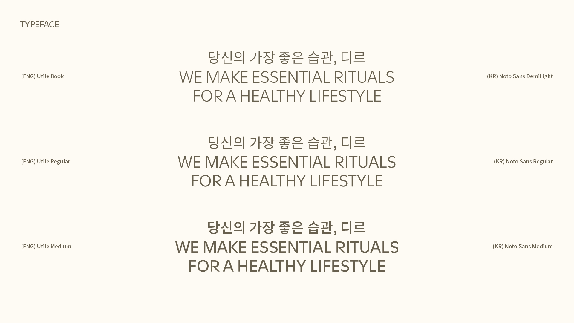영문 서체 Utile은 세리프의 고전적 권위를 담되, Book, Regular, Medium 세 가지 웨이트로 정보의 층위를 나눈다. Book은 로고와 슬로건처럼 브랜드의 얼굴이 되는 자리에 배치된다. Regular는 서브헤드와 보조 텍스트에서 중간 톤을 형성한다. Medium은 강조가 필요한 핵심 정보---제품명, 주요 수치, 행동 유도 문구---에 무게를 더한다. 한글 서체 Noto Sans KR도 동일한 삼단 구조를 따른다. DemiLight가 본문의 기본 톤을, Regular가 중간 층위를, Medium이 핵심 강조를 맡는다. 이 삼단 위계가 헤드라인에서 본문, 캡션까지 일관되게 적용되면서 정보의 경중이 글자의 무게만으로 전달된다.
