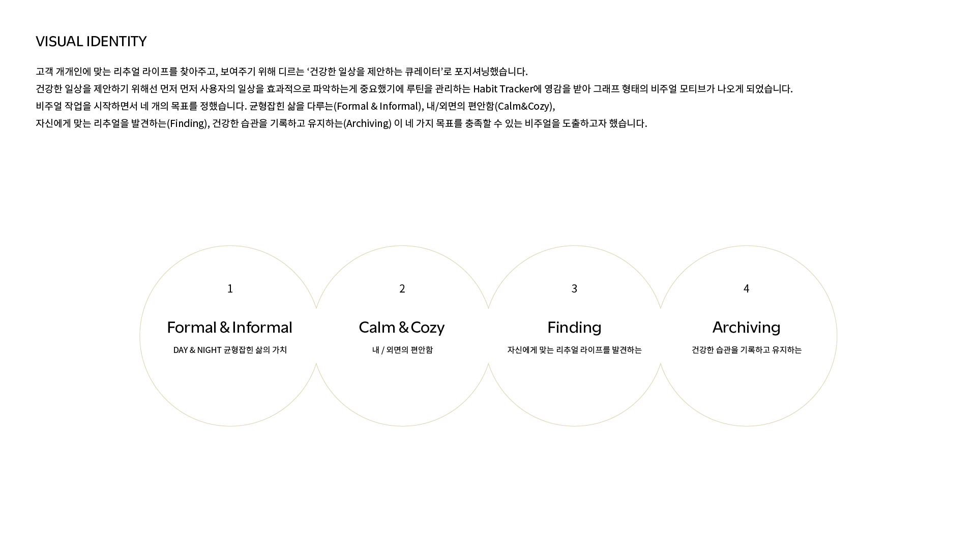 디자인 방향은 네 가지 좌표로 설정되었다. 이 좌표들은 추상적 선언이 아니라, 이후 시각 체계의 구체적 결정을 이끄는 기준이다. Formal & Informal---격식과 편안함의 균형은 세리프 Utile과 산세리프 Noto Sans의 조합으로 구현되었다. Calm & Cozy---내외면의 안정감은 Morning Yellow에서 Night Brown으로 흐르는 따뜻한 팔레트가 담당한다. Finding---자신에게 맞는 케어 패턴의 발견은 DIRE NUMBERS GUIDE의 그리드 인터페이스로, Archiving---건강한 습관의 기록과 유지는 넘버링 체계와 그래프 모티브로 물질화되었다.