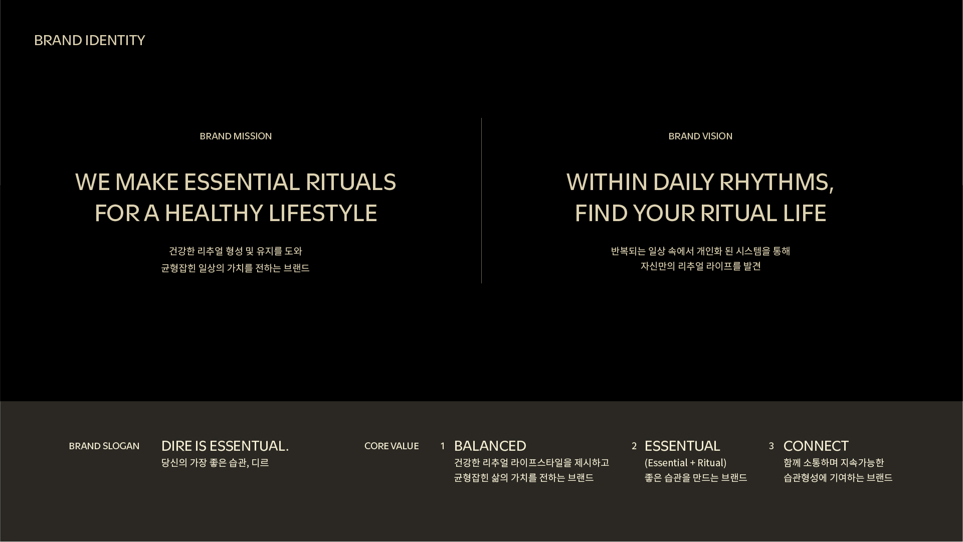 슬로건 "DIRE IS ESSENTIAL."은 이 관점을 압축한다. 한국어 슬로건 "당신의 가장 좋은 습관, 디르"는 같은 메시지를 일상의 언어로 옮긴다. 톤앤보이스는 차분하고 신뢰감 있되 따뜻하다. 지시적이기보다 제안적이며, 소비자 각자의 속도를 존중하는 어조를 유지한다. 이 톤이 실제 커뮤니케이션에서 어떻게 작동하는지는 태그라인이 보여준다. "DIRE FOCUSES ON YOUR DAILY LIFE", "WE VALUE YOUR EVERYDAY ROUTINE"---명령이 아니라 동행의 언어다.