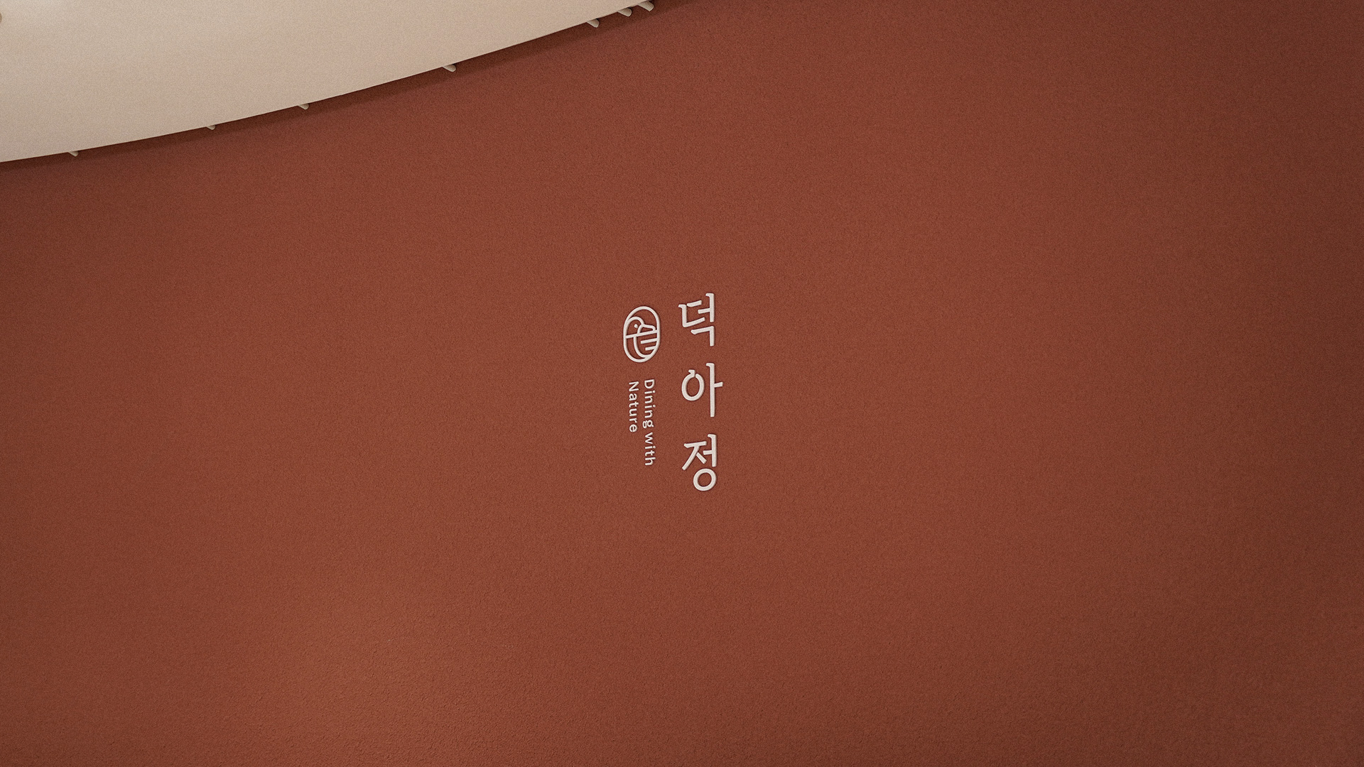 이 두 서체의 조합이 가장 선명하게 드러나는 순간은 세로쓰기와 가로쓰기가 한 화면에 공존할 때다. 사이니지에서 세로로 흐르는 '덕아정' 한글 세 글자와 가로로 놓인 영문 'Dining with Nature'가 나란히 보이면, 시선은 수직과 수평을 오가며 벽면 위에서 리듬을 만든다. 이 배치는 목판 인쇄의 세로 조판에서 힌트를 얻었으되, 현대적 그리드 위에서 재구성된 것이다. 세로쓰기가 가로쓰기를 만났을 때 생기는 시각적 긴장이, 이 브랜드의 타이포그래피 시스템이 추구하는 것이다.