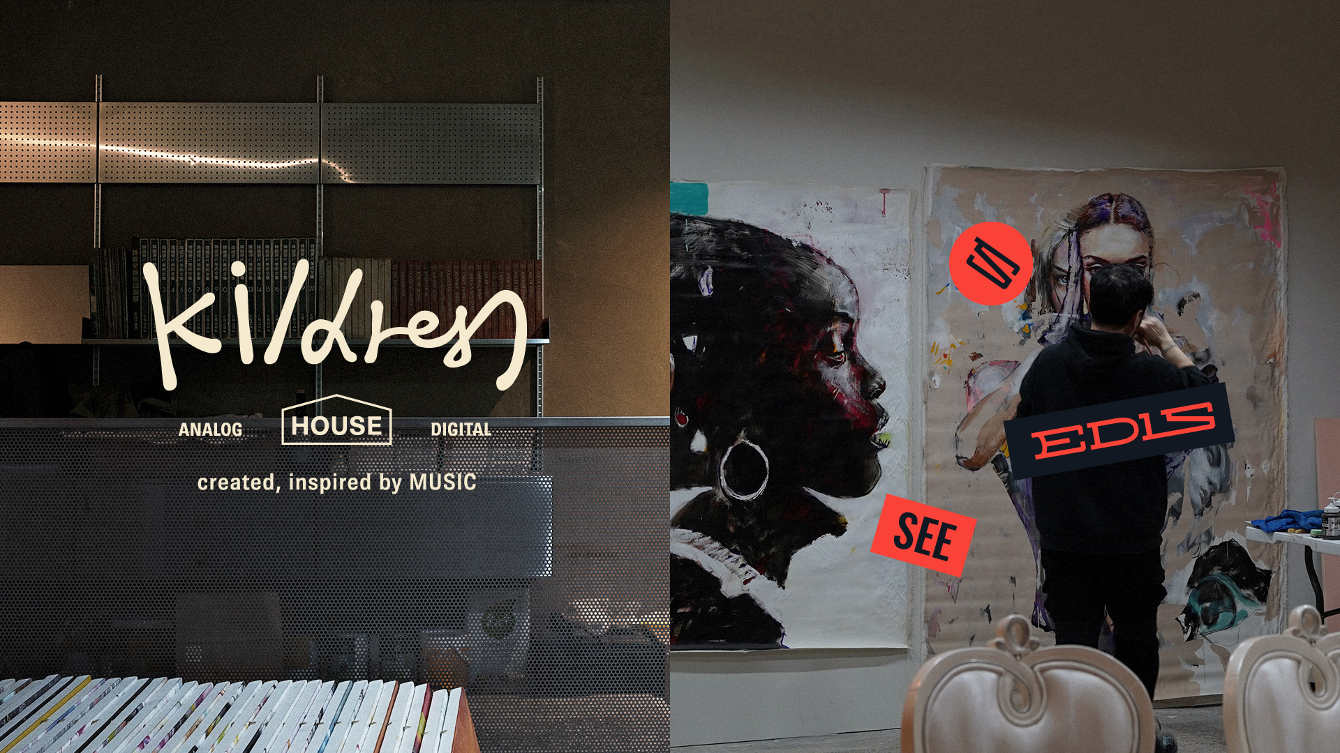 킬드런 아트하우스(kildren ARTHOUSE)는 이 공간의 독특한 축이다. 아티스트가 상주하며 작업하는 아틀리에로, 'ANALOG HOUSE DIGITAL, created, inspired by MUSIC'이라는 선언 아래 관객은 창작의 현장을 목격한다. 네온사인 로고가 선반 공간을 비추고, 그 옆에서 작가가 캔버스에 붓을 올린다. 브랜드가 말하는 '보기(SEE)'가 이곳에서 실체를 갖는다.