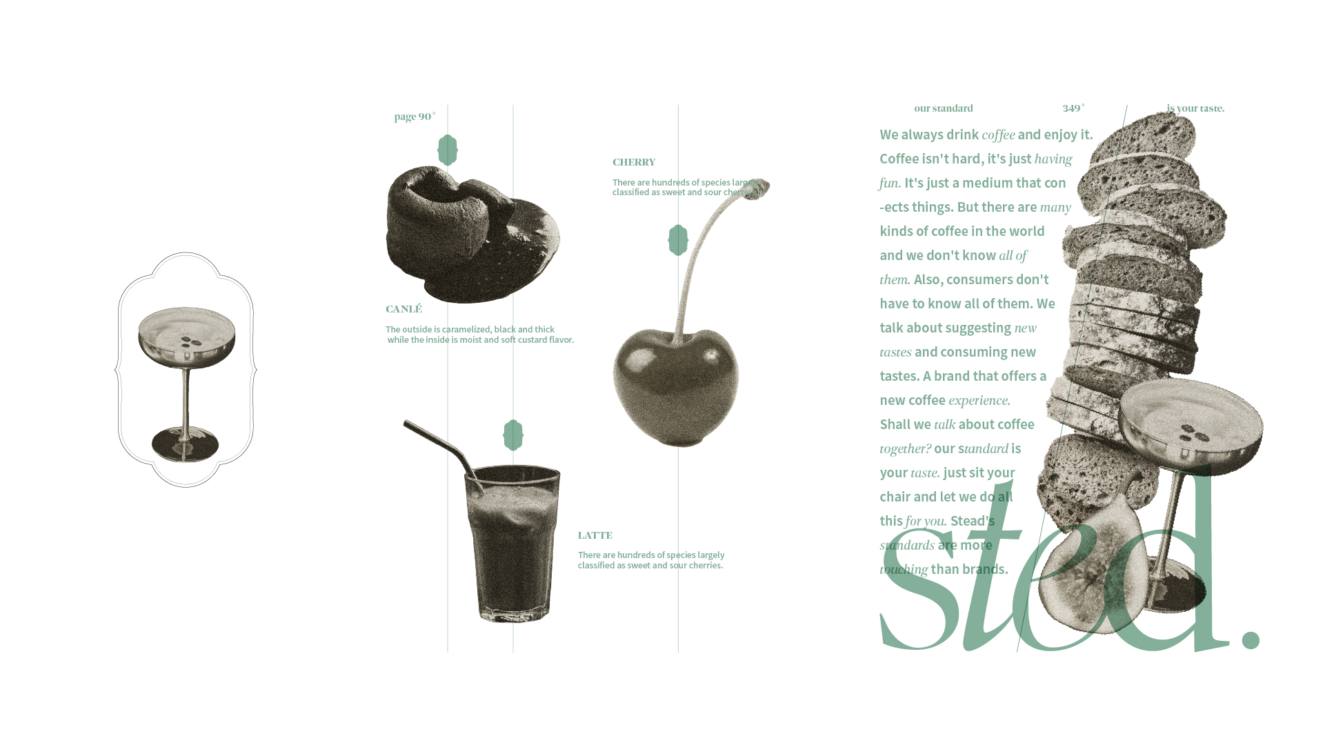 세 컬러의 조합은 STED가 추구하는 분위기 그 자체다. 커피의 갈색 계열과 민트의 녹색 계열이 중성 톤의 배경 위에서 만나면, 카페 공간에 들어선 순간의 공기와 닮은 시각적 인상이 완성된다.