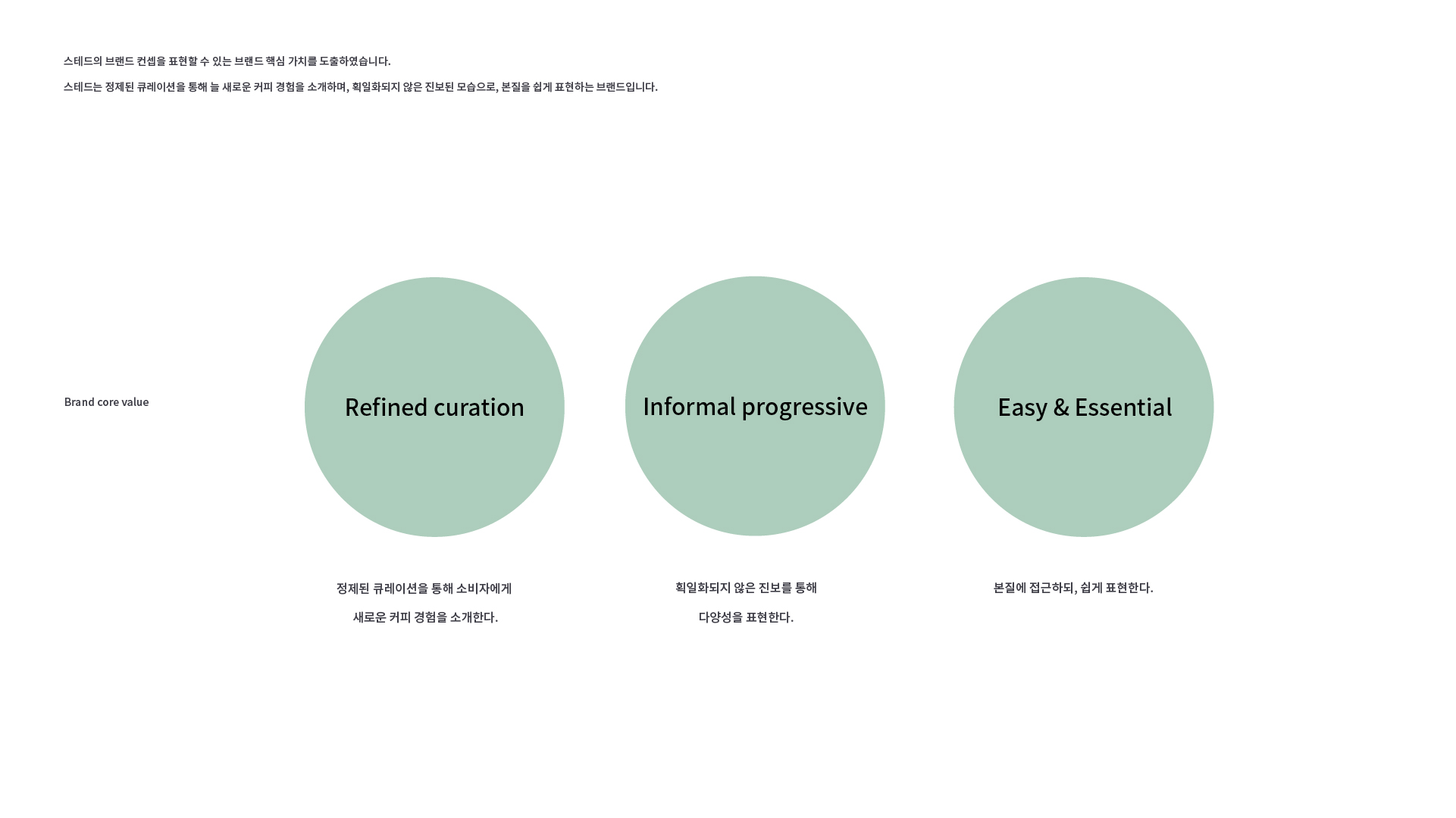"그냥 같이 커피 이야기를 해볼까요?" 이 한 문장이 STED의 톤을 압축한다. 전문가의 권위 대신 이웃의 편안함. 전문적이되 친근하고, 정보를 주되 가볍게. 브랜드의 언어는 고요하면서도 분명한 온도를 가진다. 미션은 명확하다--정제된 안내를 바탕으로 소비자에게 새로운 커피 경험을 소개하고, 브랜드의 기준이 고객의 취향으로 발전할 수 있도록 돕는다.