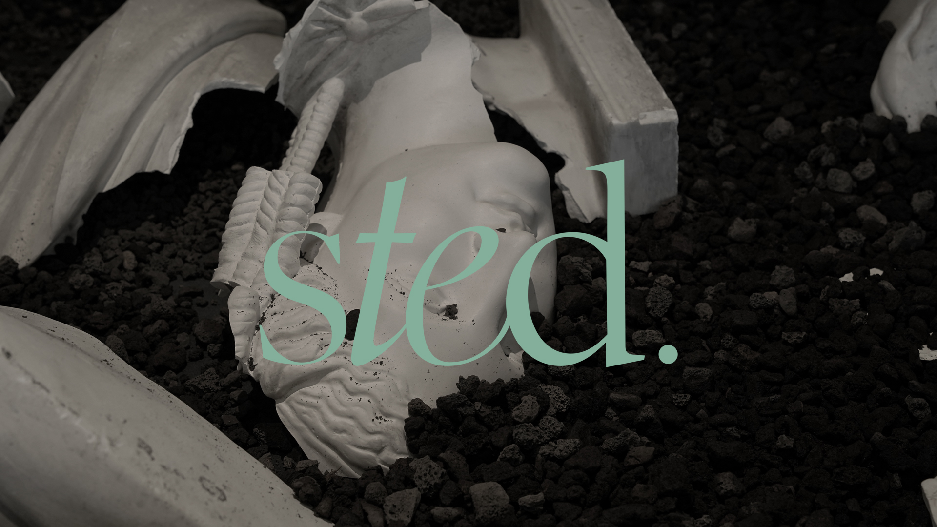Dejanire Headline이 브랜드의 이름을 쓴다. 세리프 계열의 이 디스플레이 서체는 로고와 헤드라인에서 우아함과 개성을 동시에 전달한다. 소문자 'sted.'의 형태에서 특히 두드러지는 곡선과 리듬은 브랜드의 비정형적 태도를 조형으로 보여준다.